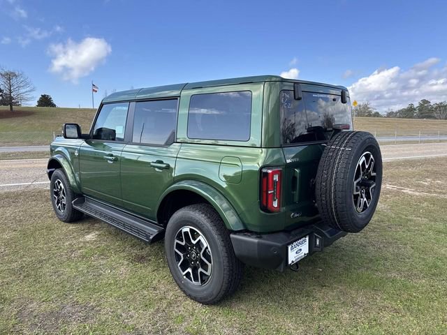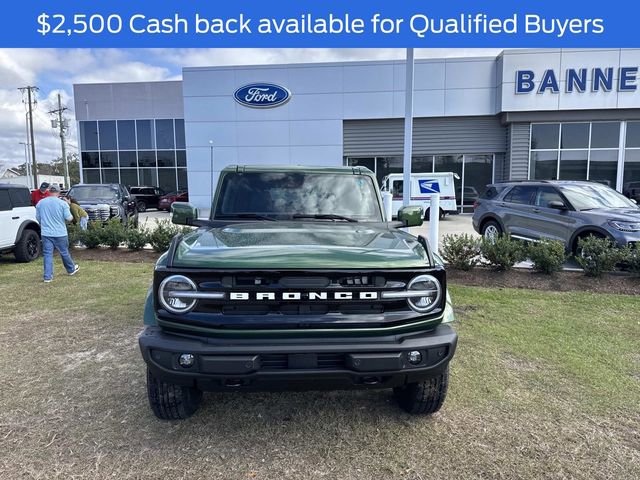 The 2025 Ford Bronco Outer Banks features a Twin Turbo Regular Unleaded V-6 2.7 L/164 engine and includes notable optional equipment such as Adaptive Cruise Control, a 360-Degree Camera, and the Lux Package. This model is equipped with a Sound Deadening Headliner and a Hard Top, Painted, enhancing both comfort and style. The Trailer Tow Package is also included, providing added utility for towing needs. The vehicle's exterior is complemented by Easy Fuel® Capless Filler, Fender Tie-Down Hooks, LED Signature Lighting, and front and rear tow hooks.