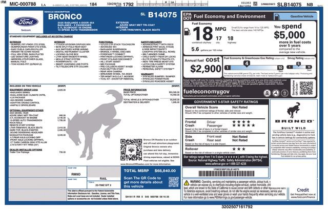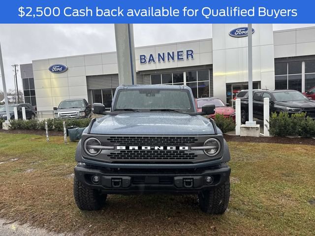 The 2025 Ford Bronco Badlands features a Twin Turbo Regular Unleaded V-6 2.7 L/164 engine and is equipped with a range of optional enhancements, including a Front Axle-Locking Differential, Lux Package, Dual-Zone Electronic Climate Control, and a 4.7/Rear Axle-Locking Diff. Additional options include LT315/70R17 R/T Tires (35"), a Remote Start System, and a Sound Deadening Headliner. The exterior is reinforced with powder-coated steel bumpers, fender tie-down hooks, full vehicle steel bash plates, and LED signature lighting. It also includes heated power glass mirrors with manual fold and tow hooks at both the front and rear.