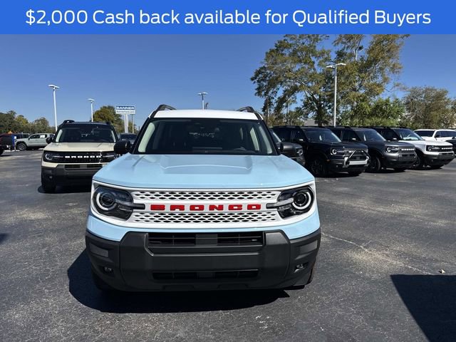 The 2025 Ford Bronco Sport Heritage is equipped with a range of notable optional features, including the Convenience Package, 225/65R17 Continental All Terrain Tires, and a Supplemental Ptc Heater. It also features Equipment Group 250A and 17" Oxford White Wheels, enhancing both its functionality and aesthetic appeal. The vehicle is powered by an Intercooled Turbo Regular Unleaded I-3 1.5 L/91 engine, providing a balance of efficiency and performance. Additional exterior features include LED headlamps, active grille shutters, and a roof painted in Oxford White, complemented by heated power glass mirrors and a rear liftgate with liftglass.