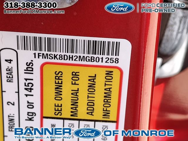 Certified. 172 Point Inspection, Clean Autocheck, Clean AutoCheck History Report, Leather Seats, 4x4 AWD, Backup Camera, Push Button Ignition, Handsfree Bluetooth Connectivity, Automatic Emergency Braking, Blind Spot Warning, Lane Departure Warning, Cross Traffic Alert, Apple CarPlay / Android Auto, Heated Seats, SirusXM Satellite Radio, Aux / USB Input, 4WD. 4WD 10-Speed Automatic 2.3L EcoBoost I-4 Red